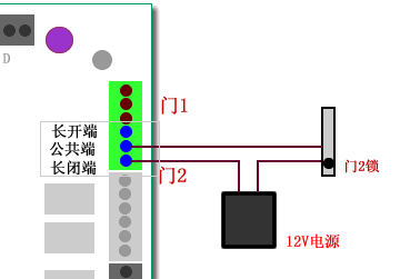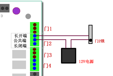 当断开电源时,锁打开 (仅画了门 2 的接线,其它门的接线类似)